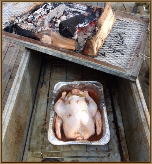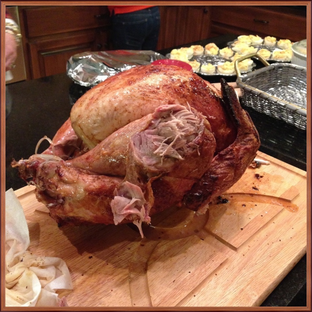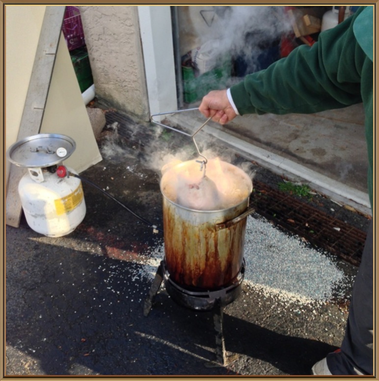 From Tony, “Being an Irish man living in Louisiana we like to mix the cultures up we usually means passing out in a pile of Crawfish after too much Jameson. This year we did it differently with some smoked sausage appetizers smoked sausage appetizers. Then we Injected the Turkey with Garlic and butter and lots of Cajun seasoning and then popped it in the Cajun microwave, then we finished it off in some rendered bacon fat in the fryer. The finished product was delicious and rather eye catching.