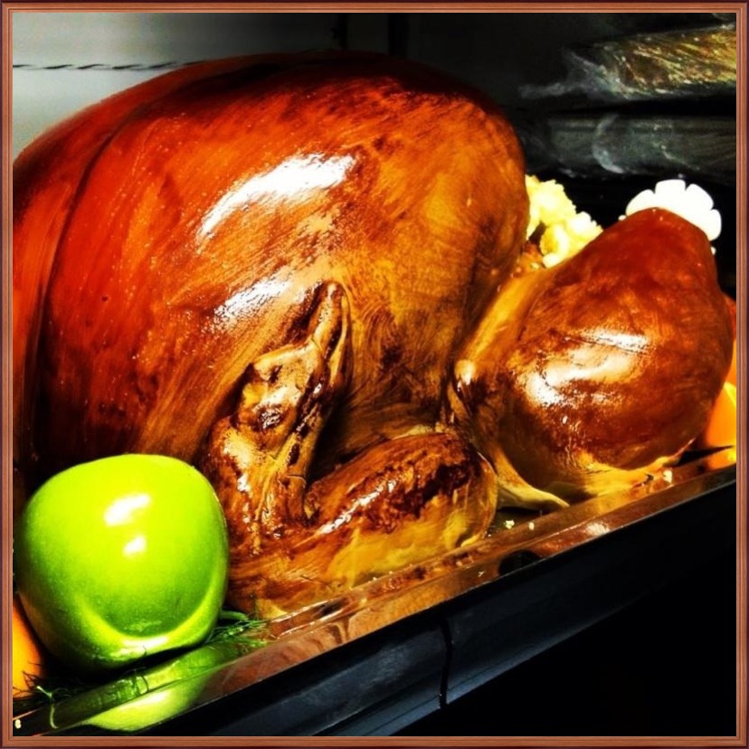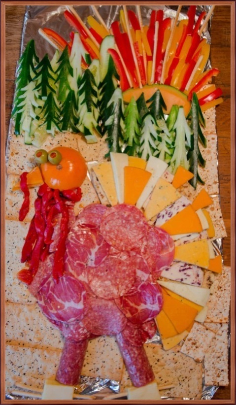 Andrew C’s turkey shaped platter, a turkey cake sent by Brian, a turkey fruit platter from Daniel’s Mom, Paul’s turkey veggie platter, and Steve’s artistic rendition of a turkey at sunrise.