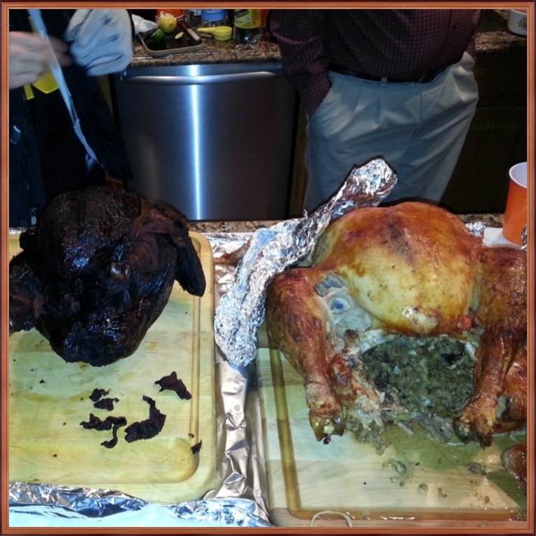 Here’s Brian’s hickory smoked turkey– his first time– took three hours and will be a new family tradition, Coleman’s perfect bird, Danny Chang’s roast turkey, turkey two ways for Jared’s family, Roger’s turkey cooked by Lisa T Charles, and Mike M’s charcoal cooked turkey after 2 and a half hours on the grill, and Joe F moved to his first house in Tampa and smoked his first turkey. Matt and Kellianne’s Turkeys round out row three. Siplast Rotisserie cooked two turkeys, and RomV19 did some deep frying.