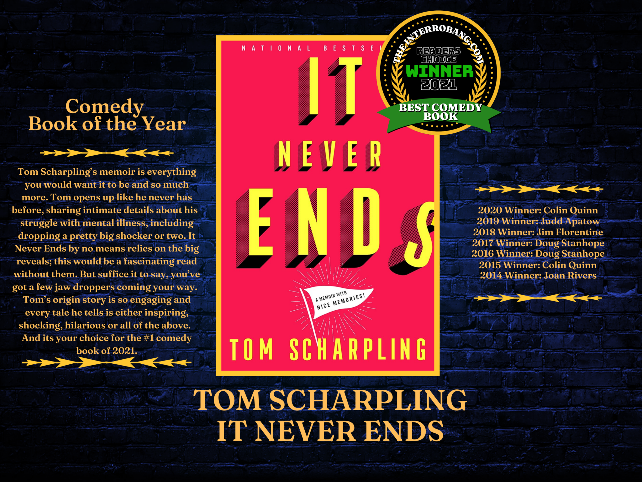 The BEST COMEDY BOOK category was a decisive win for TOM SCHARPLING and IT NEVER ENDS: A MEMOIR WITH NICE MEMORIES . This is Scharpling’s first book and first win, and it’s well deserved. IT NEVER ENDS is not only a great read, its also a great audio book available on Audible. See all the nominees here