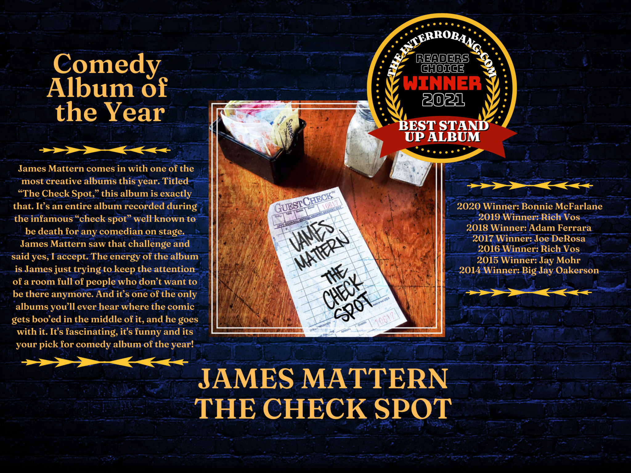 In the stand-up categories, BEST COMEDY ALBUM had so many great albums this year and that was reflected in the voting, which changed order multiple times over. Album of the year is always a close fight, and this year was no exception, with every single album on the list getting strong support from voters. But ultimately you chose JAMES MATTERN as your winner for his inventive album titled, THE CHECK SPOT, in which he boldly takes on the most difficult spot any lineup. Congratulations to every single nominee who all scored significant numbers. Read all the nominees here.