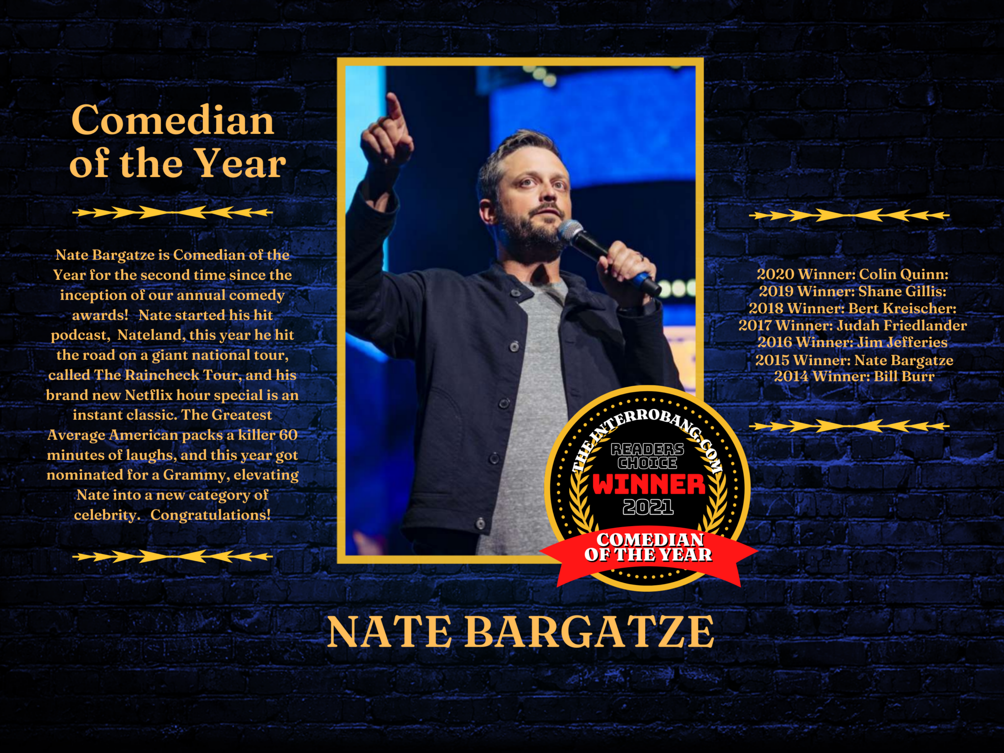 Finally, the coveted STAND UP COMEDIAN OF THE YEAR goes to NATE BARGATZE, our first comedian to repeat wins for this category. It’s a gigantic year for Nate, who was also nominated as one of the 11 best comedy specials of the year, and he was nominated for a Grammy. You can see Nate currently on tour around the country, and listen to his Nateland podcast. Read all ten of our amazing Comedian of the Year nominees here.