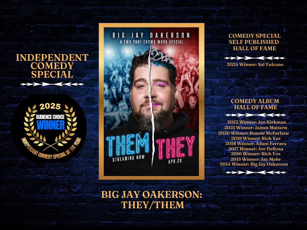 In the stand-up categories, BEST INDEPENDENT HOUR STAND UP SPECIAL goes to BIG JAY OAKERSON for his double crowd work special, THEY/THEM    Read all the nominees here.