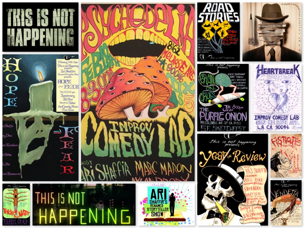 Nine years ago Monday a storytelling show started in the back room of the LA Improv curated by the club’s booker, Eric Abrams, and an up-and-coming comic named Ari Shaffir. Simply titled Psychedelia and featuring comedians telling acid and mushroom stories, their one-off show ended up launch a long running, frequently evolving show, especially once manager Sam Saifer joined them and the show evolved into This Is Not Happening. Despite splitting into a TV series by that same name and live show now titled Ari Shaffir’s Renamed Storyteller Show, the structure (and minds behind it) remain the same. Monday the two shows, and three producers, come back together for a good cause (www.gofundme.com/team-aidan-help-him-fight-leukemia) with the first ever This is Not Happening Presents Ari Shaffir’s Renamed Storyteller Show. So as they tell stories of Hope and Fear (tonight’s show) read the story of the Storytelling Show in their own words.