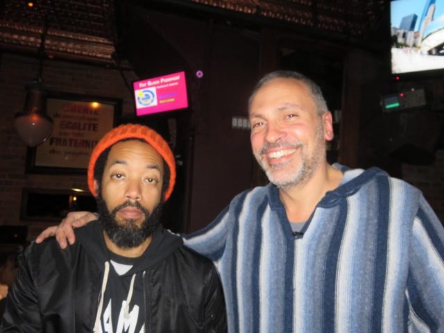 D.C. Benny inaugurated his new story-telling show at the Fat Black Pussycat this week. It was not so much an inauguration as it was a revival. I got there early and was able to reminisce with D.C. a little bit about his original comedic storytelling show at the old Zinc Bar on Houston Street. It was called Urban Myth and he did it with Ben Bailey and I remember going there to tell a story back around 2005. He’s also doing this show with Ben Bailey, but Ben was either in Denver or Denmark, (all I remember is that it started with “Den”) and wasn’t able to be there for this first show. I asked him what the difference was between his show and Ari Shaffir’s storytelling show and he said the biggest difference is that Ari’s show is on Comedy Central. But that distinction may not be as great very soon because Jim Serpico from Apostle was there filming the show and told me he’d be filming for the next couple of months. Because it’s very rare that I get to stay for any whole show, I sat upstairs with D.C. Benny’s wife, and P.J. Landers, comic and ex-Boston Comedy Club owner whose old club was rebuilt exactly to use as a set in HBO’s Crashing, the hit show from Pete Holmes and Judd Apatow. There’s a weekly theme. This week it was New York Stories and D.C. told me he knows enough about each story to make sure they don’t overlap. I stayed long enough to hear stories from D.C., Wyatt Cenac, Selena Coppock, and Mike Britt. I hated to leave, but I had to get to other shows.