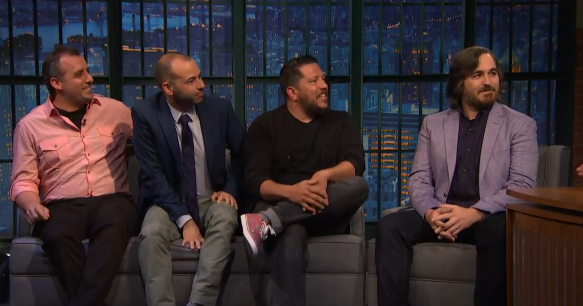 The Impractical Jokers went on Late Night with Seth Meyers last night to promote 100 episodes of their truTV show. And they’re celebrating with a tightrope from 5 stories high live in New York City. Most people get a cake or some champagne but Sal, Joe, Murr and Q do things their own way. Or in this case, it’s for a good cause.