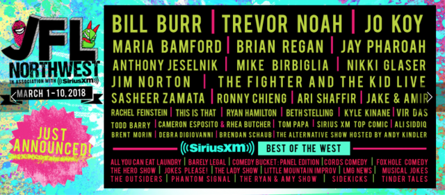 Of course, let’s not let that exciting bit of news distract from the great initial lineup of comics that JFL NorthWest just announced. Some of those names include Bill Burr, Jim Norton, Maria Bamford, Nikki Glaser, Ari Shaffir, Jay Pharoah, Rachel Feinstein, Tom Papa, Brian Regan, Mike Birbiglia, Sasheer Zamata, Kyle Kinane and a host of other solo acts. In addition to the international talent the fest is bringing in, they’ve also enlisted a ton of local talent for their Best of the West series, including Barely Legal, All You Can Eat Laundry, Cords Comedy, Jokes Please!, The Lady Show, Little Mountain Improv, Phantom Signal and much more.