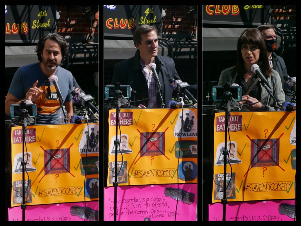Speaking on behalf of all of New York City’s comedy clubs, Kambri Crews who owns QED comedy club, Emilio Savone of New York Comedy Club, Marko and Tia Elgart of Eastville Comedy Club, and James Dolce from Governor’s Comedy Club asked why their businesses are being left out of plans to reopen the State of New York for business. Comedians Christian Finnegan and Ophira Eisenberg shared their perspectives as well, supporting the clubs.
