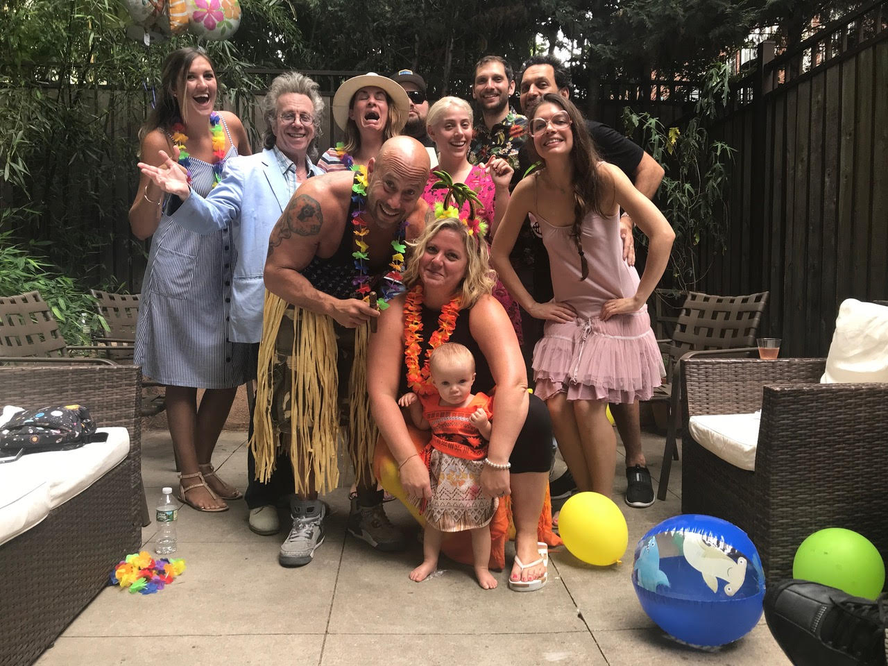 And I finished my comedy week off at Piper Berg’s first birthday party along with a bunch of comics. It was particularly nice that her parents came, Aaron Berg and Christine Meehan-Berg, dressed in Hawaiian attire. Aaron wore a grass skirt to go with his tattoos and muscles and showed his prowess at the barbecue. In between the festivities, I got some of the comics to tell me what was going on for them.