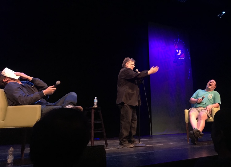 “The Benson Interruption” is a show in which the host, Doug Benson and comedian Mark Forward would bring a third comedian onto the stage who would either tell a story or go into actual written material and then…. Doug Benson and Mark Forward would take turns interrupting them all throughout their set. Ron Bennington described the experience as, “keeping comedians on their heels” due to the feeling of being pushed back by the funny yet frequent interjections coming from the hosts. Ron may have felt like he was being kept on his heels, but you would never have guessed it with how he maintained complete control of the stage. Bennington even kicked Mark Forward off the stage at one point and made him go sit in the audience! Bennington then replaced him with an audience member who Ron felt had funnier remarks! It was hilarious!
