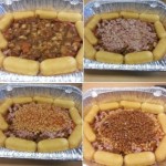 Now layer your beans first, then your hash, followed by the stew, and a full layer of spaghettios, being careful to spread each layer evenly around the casserole dish, one layer of canned goodness on top of another.