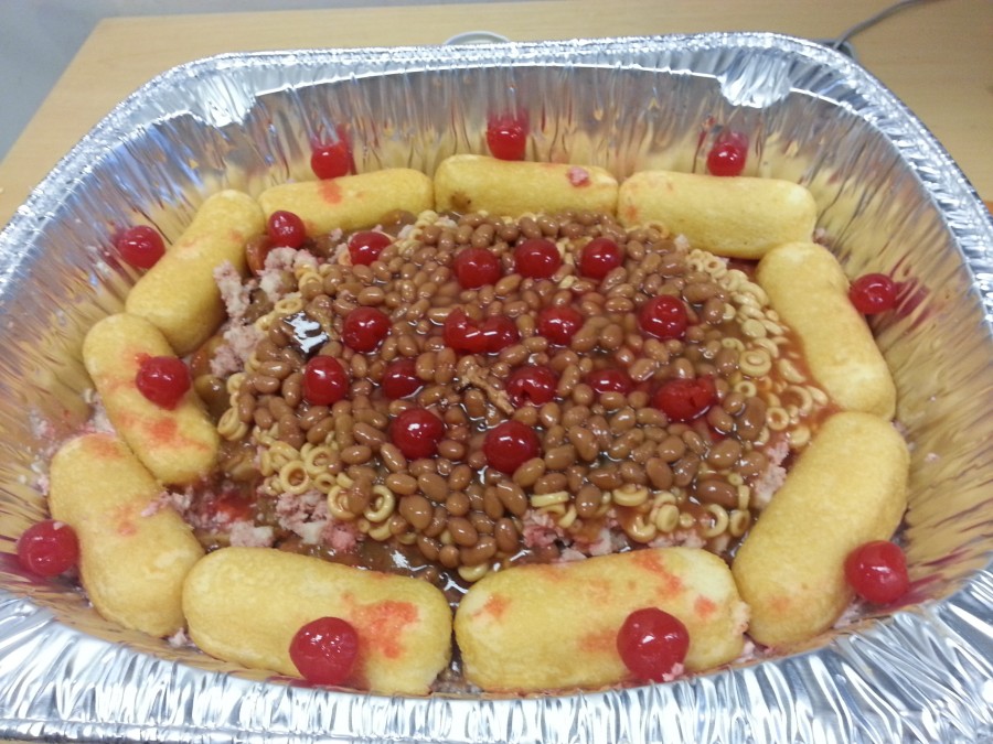 Dot the top with Maraschino Cherries.  Using this near-fruit will give you the sense that you did at least try to make this healthy.  Finally, heat until warm all the way through in a microwave or over a fire if your apocalypse has no power until all the canned lard is completely melted.