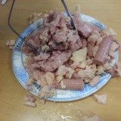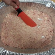 Once you get them into a liquid meat combo, spackle that along the bottom of a casserole dish.  Try to get an even layer and texture of meat by-product, grease and any extra fluids that were present in the can.