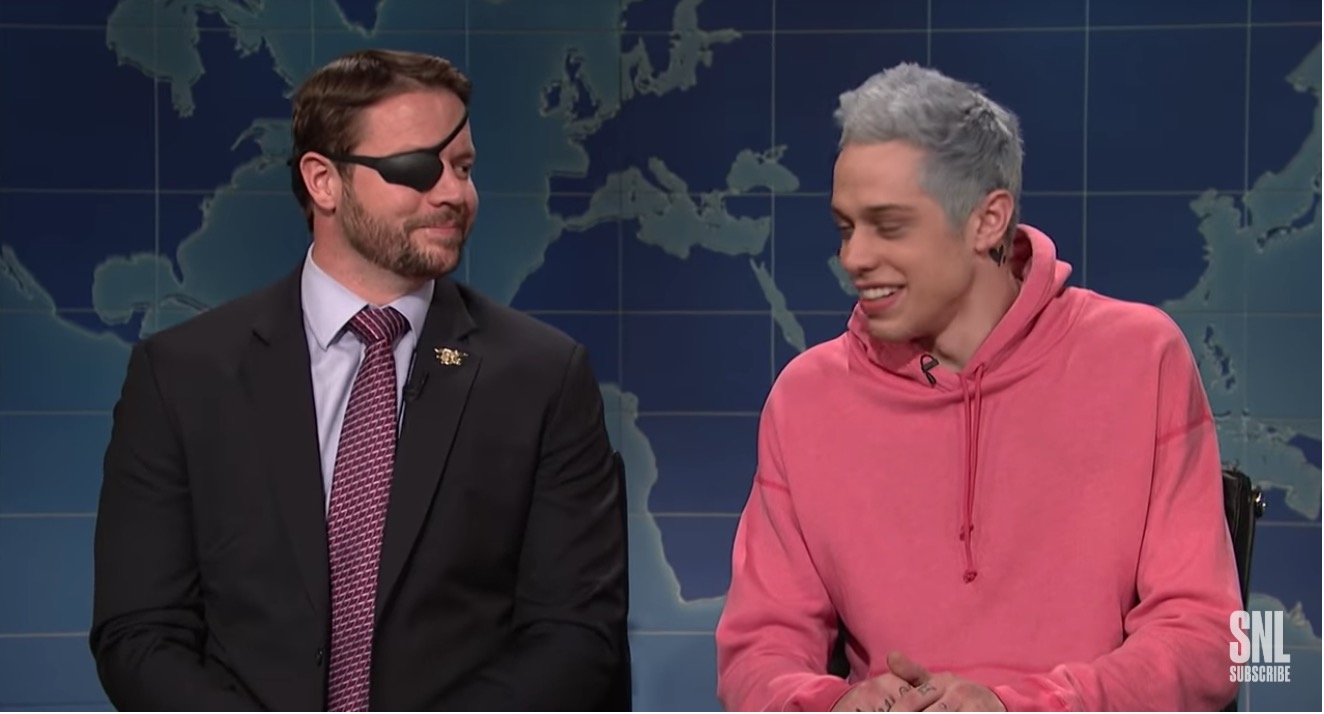 Kenan Thompson had told the panel on The View that the incident would be handled “internally.” But then last night Weekend Update host Colin Jost introduced Pete during the Weekend Update segment, saying Davidson was there to “set the record straight.” Pete joked that he makes poor choices, and said “on behalf of the show and myself, I apologize.” I mean this from the bottom of my heart, he said. “It was a poor choice of words. The man is a war hero, and he deserves all the respect in the world.” Pete took credit for providing a platform that democrats and republicans could finally agree about: “that I’m a dick,” he said. With that, the camera panned left to reveal Crenshaw himself sitting at the desk. “Ya think?” he answered. Crenshaw thanked Pete for “making a Republican look good,” and Pete explained how and why Dan got his eye patch in the war. Dan apologized, and took the chance to take throw some metaphoric tomatoes at the apologetic Pete. He lobbed a few insults Davidson’s way and wrapped with a positive Veterans day message.