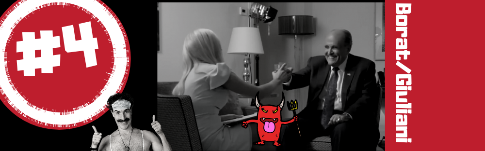 Giuliani Begins a Dizzying Tour Into Batshittsville With a Still From the Movie Borat. After Sacha Baron Cohen announced that the sequel to Borat had been filmed, edited and would be released this year, but before the actual release of the movie– a still photo from the film circulated showing Giuliani with his hands down his pants during an interview. The photo went viral, and was the first in a epic slide of embarrassing moments for the former mayor that included the Four Seasons incident, the hair dye incident, and farting on tv.