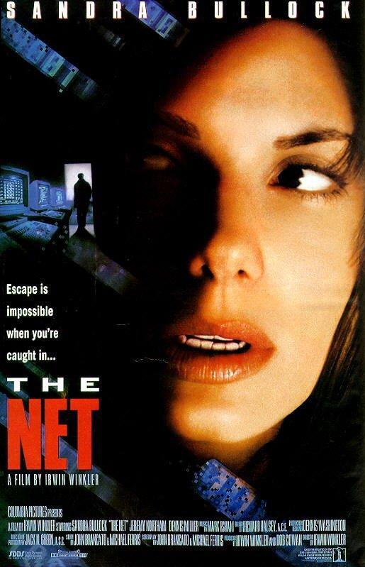 - The Net – 1995. Sandra Bullock blew up in Speed. She followed that up with this 1995 hacker movie. For some reason her only interactions in life are through her computer, so in real life, no one can identify her. This is bad news for her since she gets targeted by a cyber terrorist syndicate. Why? Because a friend of hers sent her sensitive government information. Meanwhile, she’s been using that new fangled device called the internet to order pizzas to her house, live her life, and even get packages delivered to her door! After being targeted she gets her life erased from computer databases and has her social security number associated with a known criminal. In the film she has to deal with an assassin who’s been hired by the scary international cyber terrorist ring. Wonder if Anonymous has hired killers on their non existent payroll? Watch the trailer.