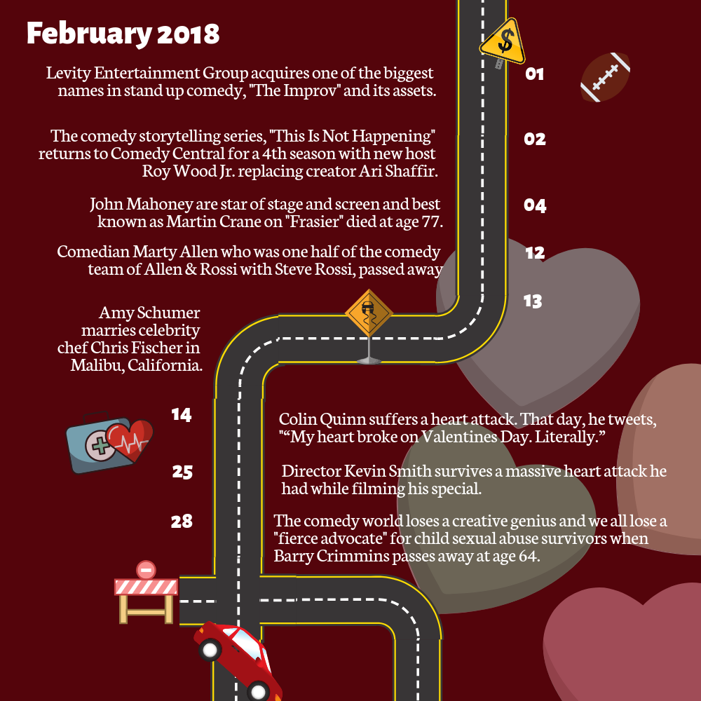 February 14, 2018 – Colin Quinn suffers a heart attack. That day, he tweets, ““My heart broke on Valentines Day. Literally.”
