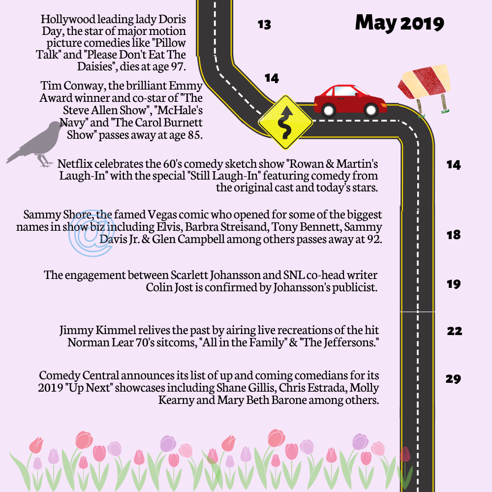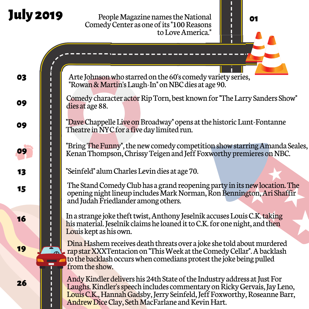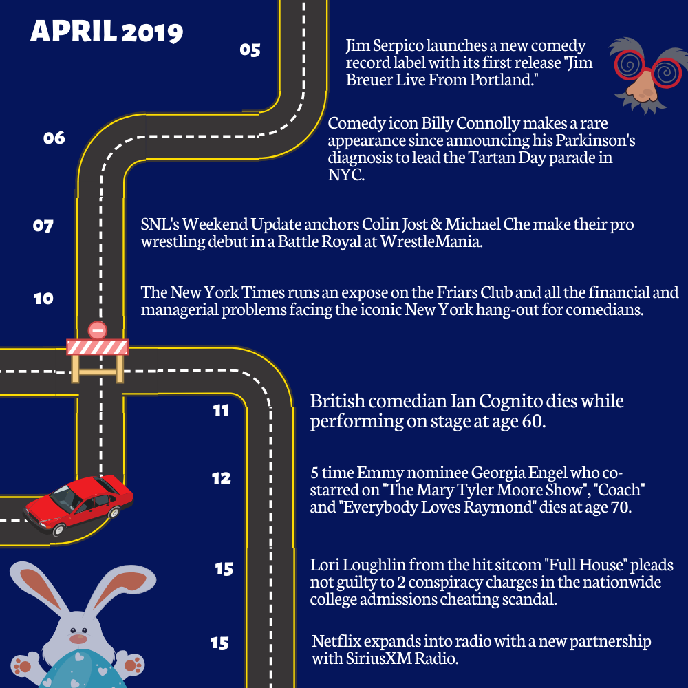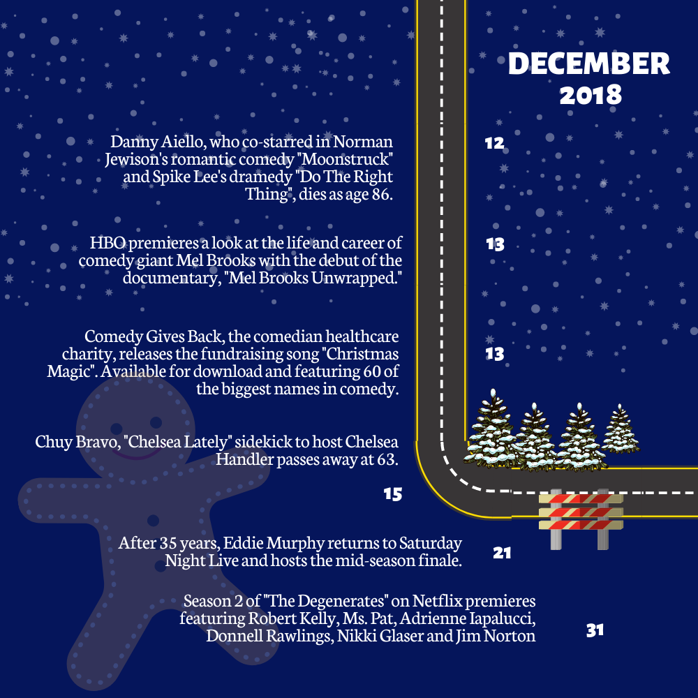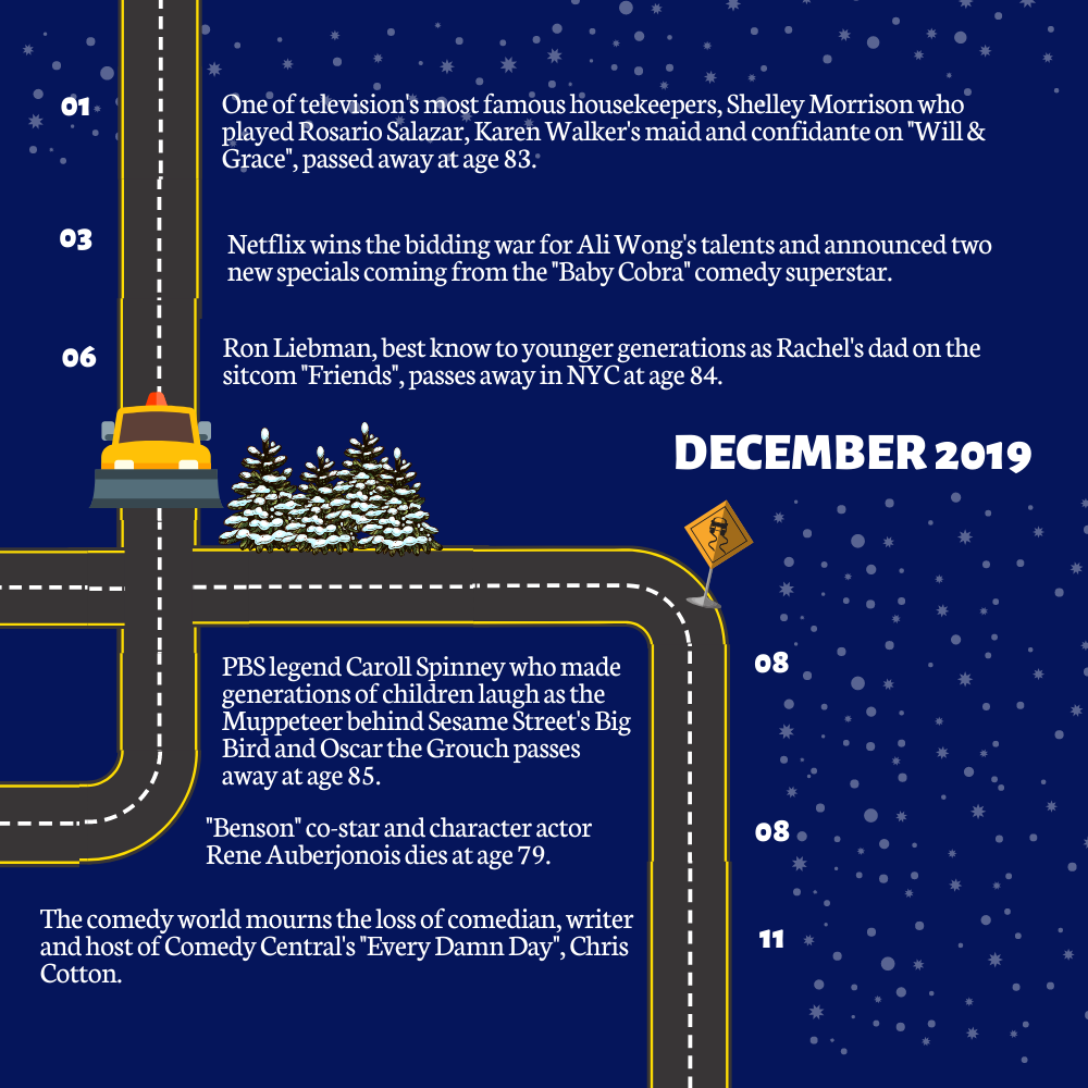 Comedy in 2019. SO MUCH to talk about– so many sad passings, some especially hard hitting but as always there were also new accomplishments, firsts, and exciting career rebirths. Once again, we put together a timeline to highlight the big news stories about those in the comedy world for the year. Here’s our tribute to 2019, a big year for comedy with tears, shouts, fights, and of course, laughs. The end of a year and the end of a decade. Raise a glass, and get ready to see what 2020 brings.