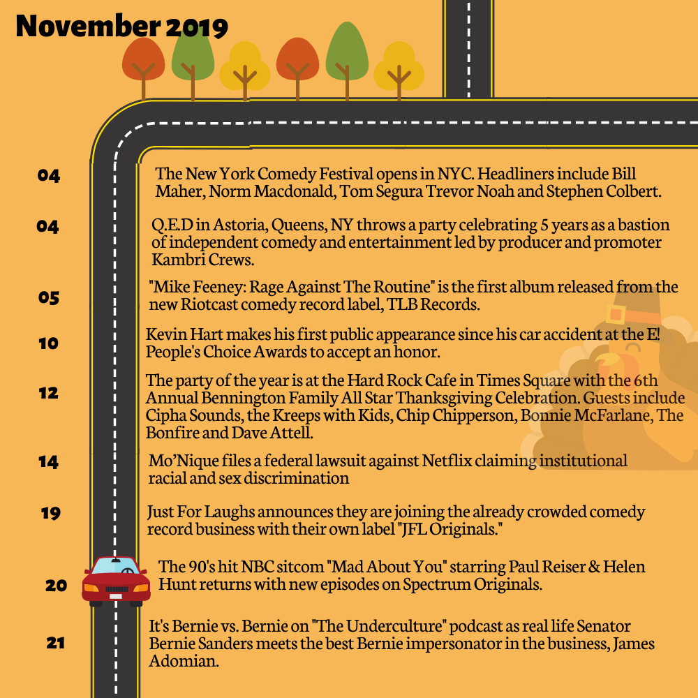November 4, 2019 – The New York Comedy Festival opens in NYC. Headliners include Bill Maher, Norm Macdonald, Tom Segura Trevor Noah and Stephen Colbert.