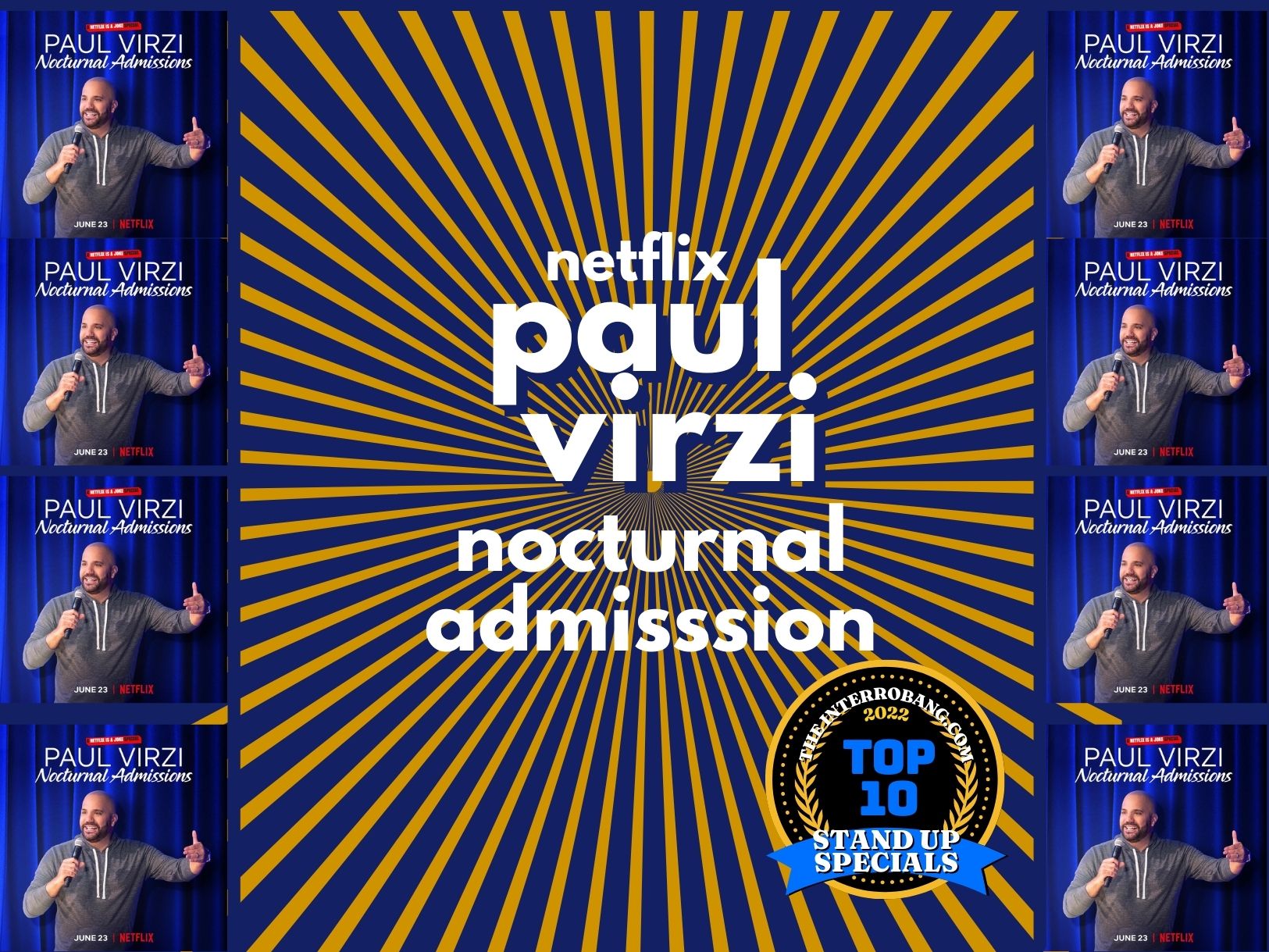 PAUL VIRZI. NOCTURNAL ADMISSIONS  NETFLIX.  Paul Virzi’s second hour special shows that Virzi has stepped up and is ready to compete in the big leagues.  He’s deadly serious about being funny, and Nocturnal Admission is proof that he’s here to stay. Paul has found his stride in this joke packed hour. It’s very traditional comedy, covering familiar topics like raising your family, while still dealing with the craziness of your parents, relating to your community, and getting older.  But though the topics are familiar the comedy is 100% original and unique. Virzi impressively navigates the line between shocking and relatable so skillfully you might not even realize he’s crossing boundaries.  Standout moments include a hilarious conversation about “cholos”,  and stories about his eccentric Sicilian dad who is sure he saw a UFO. Personal, silly and dark stories from a family man, that will have you laughing the entire way through.