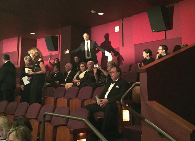 You may have noticed what seemed like disruption from above during the acceptance speech for best animated feature by the guys from ‘Big Hero 6’.   Well it wasn’t a disruption.  Turns out it was a very excited T.J. Miller, in the very last row of the theater (who knew you could actually be sitting with a wall behind you somewhere at the Oscars?).  Not only did the guys on stage give him a shout out and a big wave, but he got a cut- away shot with the camera attempting to capture the moment but he was too far away for even the Oscar cameras to clearly pick up what was happening.