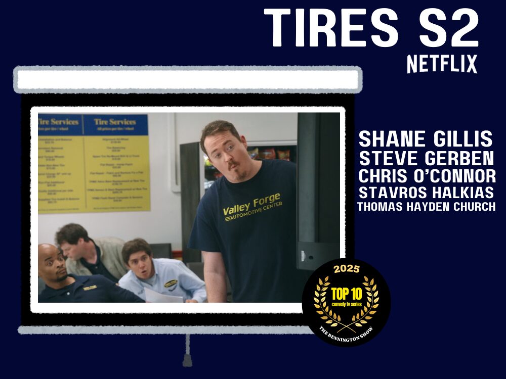 TIRES. NETFLIX. Last year’s winner and our favorite situation comedy is Tires, and the series came back for a Season Two that topped the first season. The team at Valley Forge Automotive Center is back bringing all the chaos that made the series a sleeper hit along for the ride. Season 2 expands the world of the struggling auto-repair shop and sharpens its mean stick. Will is still wildly unprepared to run the biz, Shane is still actively making things worse and season 2 brings bigger storylines, more dysfunction, class tension, and spot on portrayal of the misery working a dead end job. Season 2 proves that Tires isn’t just a novelty—it’s a sharp comedy deserving of your vote for best comedy of the year.