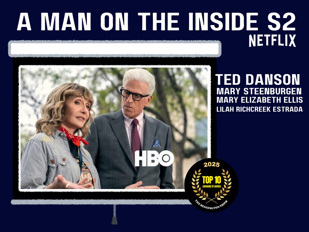 A MAN ON THE INSIDE, SEASON 2, NETFLIX. Mike Schur is the king of the comedy series right now, or at least one of them, and he delivers once again with a hilarious and bingeworthy second season of the series led by Ted Danson. A Man on the Inside’s sophomore season delivers again, on the Danson/Schur formula of heart, likeability, with a moral center and a mission. Ted Danson continues to be effortlessly watchable as the unlikely undercover operative, bringing warmth, curiosity, and impeccable timing to a role that thrives on subtlety rather than punchlines. And Danson, at age 77, proves he’s got more to share, adding physical comedy to his comedy toolkit. Season two adds a love interest for Charles Niewendyk and we could watch Ted and real life love-of-his-life Mary Steenburgen endlessly. Add in Schur’s penchant for easter eggs, and you’ll find yourself happily binging season two straight through.