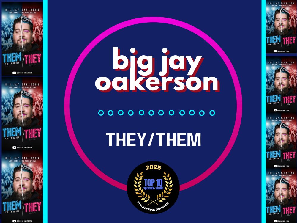 BIG JAY OAKERSON: THEY/THEM (YouTube) Big Jay went big in 2025, with two hours released on YouTube. His double special, They/Them racked up 2.6 million in views this year, with two hours of raunchy, intrusive, hilarious crowd work. And Oakersons fans showed up ready to be worked. None of this is stock material. Jay shows why he’s one of the best in the business at mining the crowd for material, riffing and creating bits aroudn their stories, identities and situations. Insane breakup stories, crazy details about someone’s sex life, people doing jobs they shouldn’t be doing- and so much more. Both hours were filmed at the world famous Comedy Works in Denver, Colorado.
