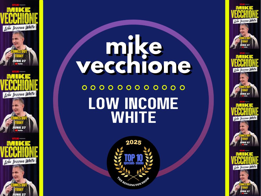 MIKE VECCHIONE: LOW INCOME WHITE (YouTube) Executive produced by Nate Bargatze, Vecchione brings his gritty, Northeast rhythm and deadpan charm to a set that makes the mundane feel high-stakes. 400,000 have tuned in to watch Mike’s best hour yet, where he riffs on average joe, blue collar, low income white types. With tight pacing, smart writing and laser sharp observations, this is an hour not to be missed. Mismatched tupperware lids, having “good” sweatpants, shopping at Aldi’s, all hilarious signs of where you are on society’s social pyramid. In one of the highlights of the hour, Vecchione compares and contrasts his family behavior, with his wife’s higher class family habits. If you too come from a mixed income family, you’ll appreciate this even more. Filmed at The Lab at Zanies Nashville and directed by Mike Lavin, it streams on Nate Bargatze’s Nateland Channel on Youtube.