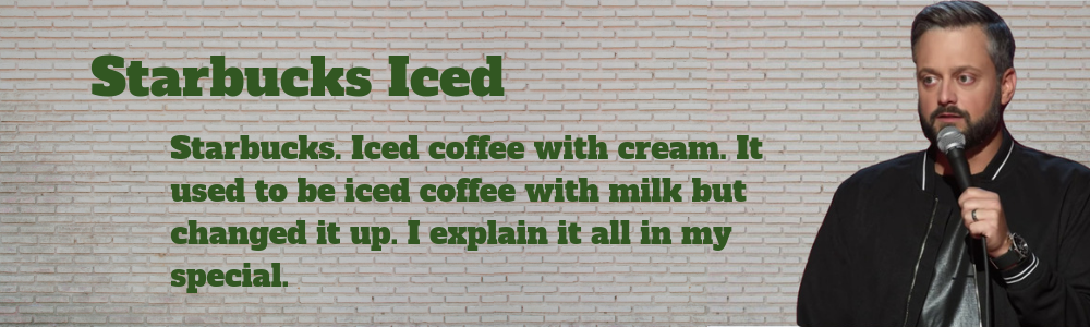 Starbucks. Iced coffee with cream. It used to be iced coffee with milk but changed it up. I explain it all in my special.