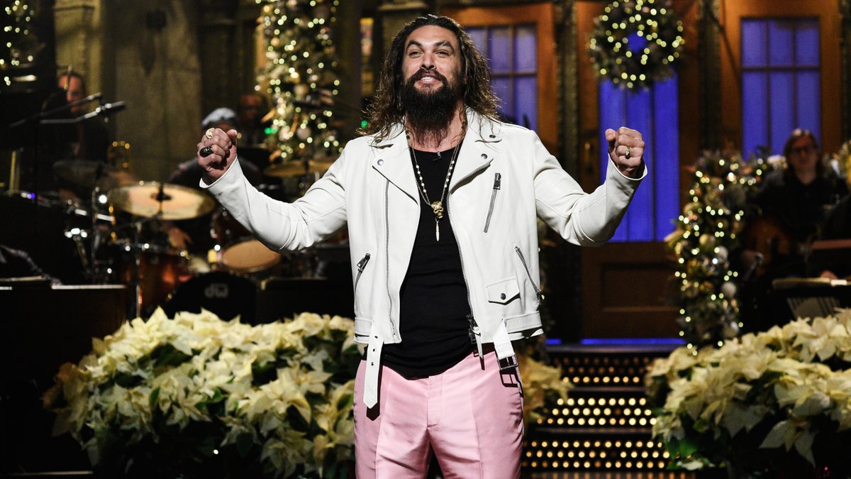 Jason Momoa’s monologue tonight is done barefoot and in pink leather pants. That may be different for an SNL host’s monologue, but the show does go back to its standard practice of giving a first-time host some back up from the cast and a musical monologue to perform. Momoa is joined by cast members Kenan Thompson, Leslie Jones and Chris Redd where they perform some “Aqua Boogie” by P-Funk in honor of their host Aquaman.